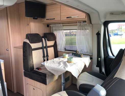salonu, z otwartymi podwójnymi drzwiami, oferuje panoramiczne widoki i świeże powietrze, przekształcając się w nocne łóżko typu king-size (200 x 176 cm). Ponadto, z przodu znajduje się jadalnia na cztery osoby, składająca się z podwójnej tylnej ławki z pasami bezpieczeństwa naprzeciwko obrotowych foteli kierowcy. Jadalnia może być przekształcona w drugie łóżko, odpowiednie dla małych dzieci.